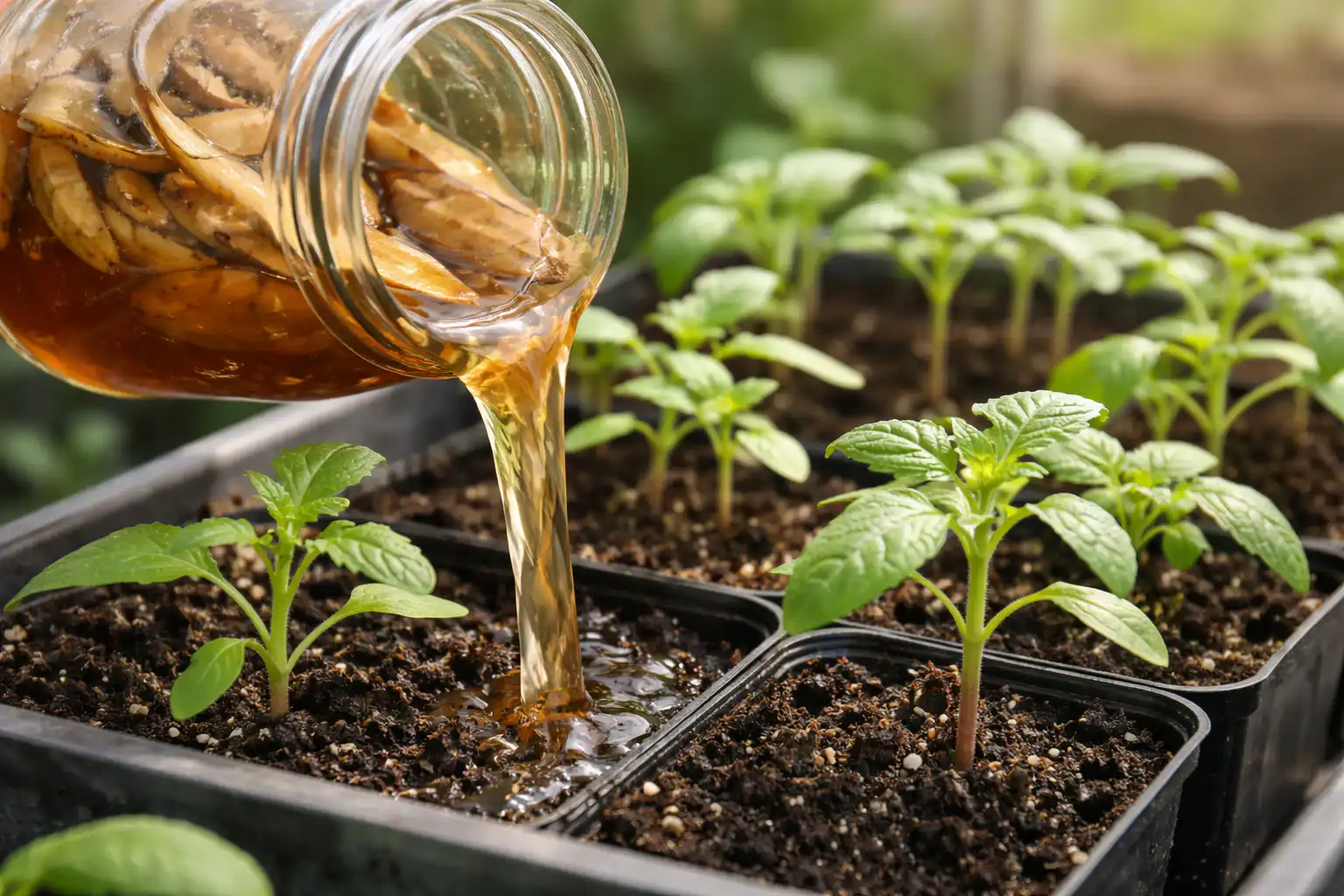 Pavasara gaismas un uztura trūkums pārvērš jaunos stādus gaišos un iegarenos asnos, kas pēc transplantācijas riskē nomirt. Tā vietā, lai iegādātos apšaubāmas ķimikālijas, izmantoju gadu gaitā pārbaudītu banānu mizu uzlējumu, kas piegādā augus ar kāliju un fosforu vispieejamākajā veidā. Šī metode ļauj nedēļas laikā nostiprināt stublāju un stimulēt spēcīgu sakņu sistēmas augšanu, neriskējot pārbarot maigos stādus.