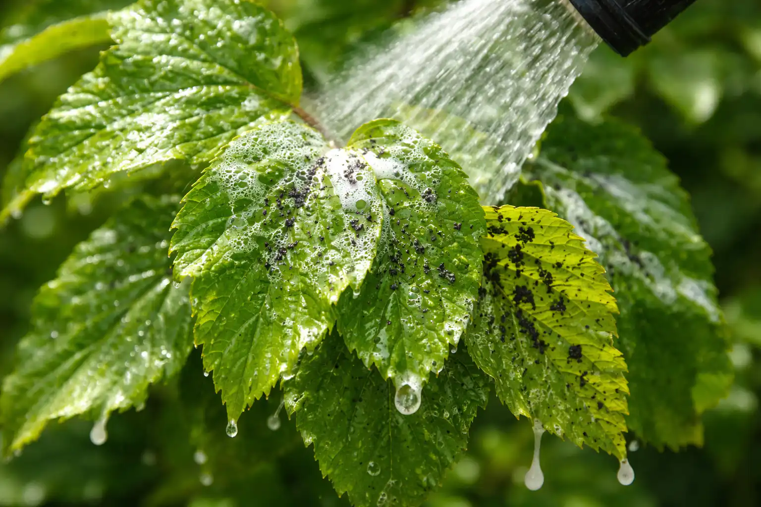 • Veiciet procedūru tikai vakarā vai mākoņainā laikā. • Saules stari, kas iet cauri šķīduma pilieniem, var izraisīt apdegumus uz maigas lapotnes. • Ja lapa ir pārāk cieši saritinājusies, labāk visu zaru uz dažām sekundēm viegli iemērkt šķīduma spainī. • Divas dienas pēc procedūras noskalojiet krūmu ar tīru ūdeni no šļūtenes, lai noņemtu atlikušo ziepju plēvi un mirušos kukaiņus.