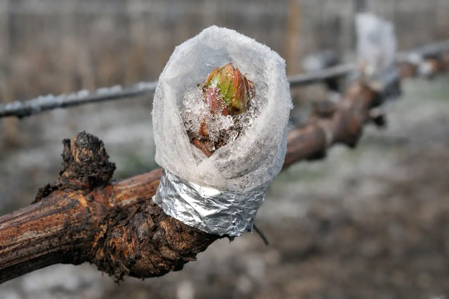Tumšie ūdens trauki, kas novietoti zem krūma, uzkrāj dienas siltumu un lēnām izdala to naktī, paaugstinot temperatūru ap vīnogulāju.