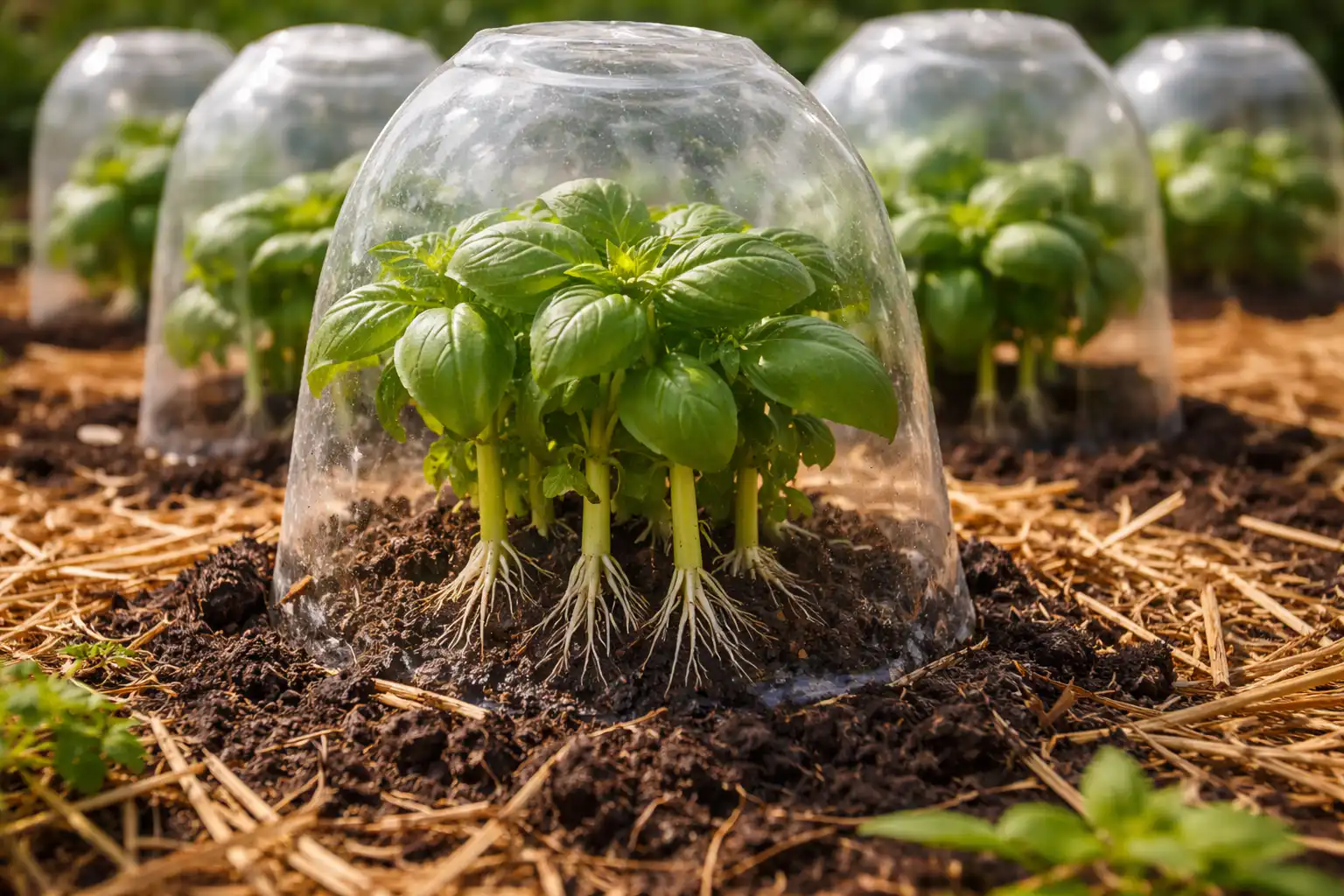 Cieši pārklājiet katru krūmu ar caurspīdīgu plastmasas pudeli ar nogrieztu dibenu.