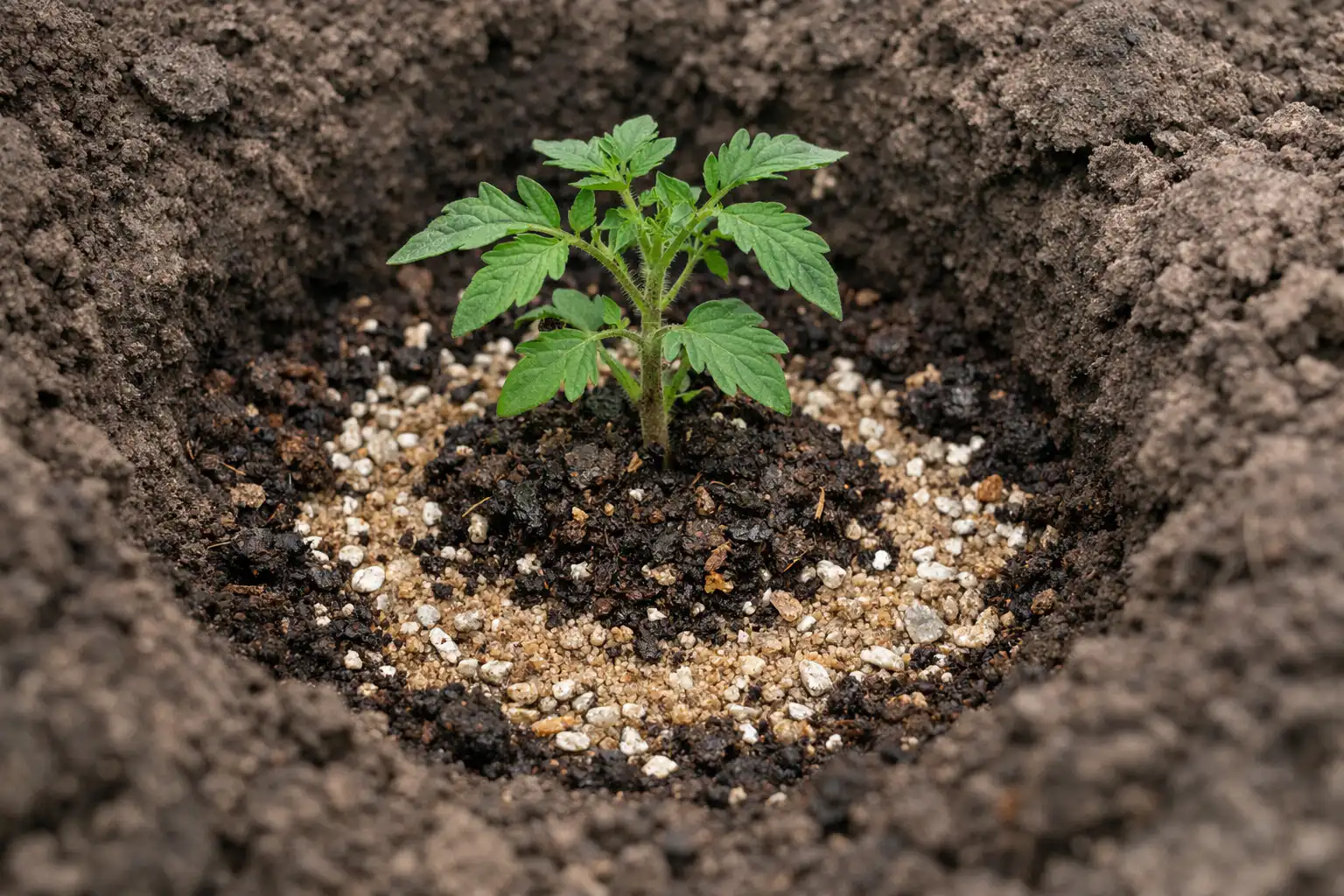 Galvenais tomātu izdzīvošanas noslēpums slēpjas rupju upes smilšu un sapuvuša komposta pievienošanā nevis visai dārza dobei, bet lokāli, radot dzīvību glābjošu gaisa spilvenu ap sakņu kamoli.