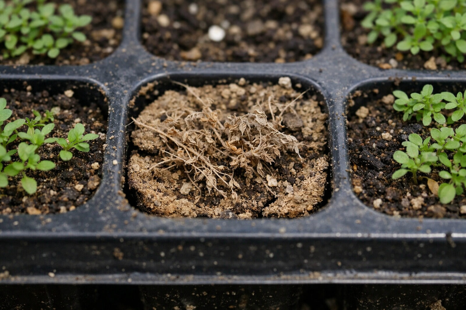Dārznieki bieži jauc banālu izžūšanu ar bīstamām infekcijām. Saspringtos apstākļos nolaišanās kasetes Robeža starp ūdens trūkumu un aizsērēšanu ir ļoti plāna, un ierobežotais zemes apjoms uzreiz zaudē dārgo mitrumu.