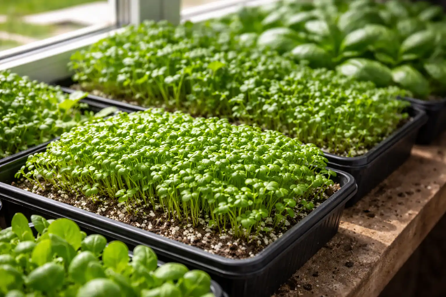 Ātra sākuma noslēpums ir pareizo sēklu izvēle. Jums nevajadzētu nekavējoties uzņemties kaprīzus augus; labāk ir dot priekšroku kultūrām, kas piedod iesācēju kļūdas. Viņi labi parāda sevi kreses, lapu sinepes Un rukola. Viņiem ir augsta dīgtspēja, un tie veido biezu galvu jau agrīnā stadijā.