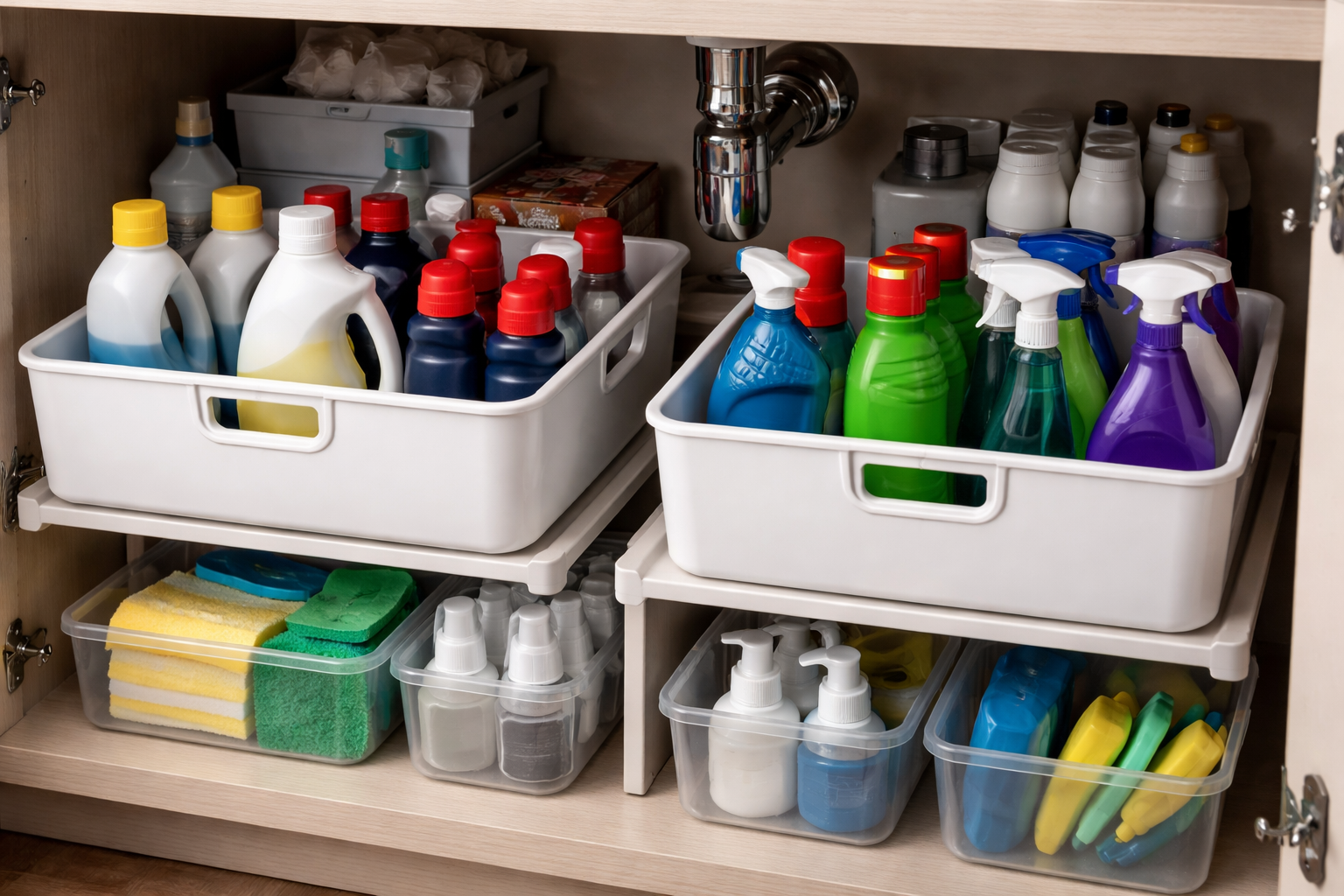 Mans personīgais padoms pēc simtiem virtuvju apskates: izmantojiet pagrieziena galdus, lai zem izlietnes uzglabātu ķimikāliju burkas. Tas novērš nepieciešamību ielīst dziļi tumšā skapī un līdz nullei samazina risku nejauši apgāzties un izšļakstīt bīstamu šķidrumu.