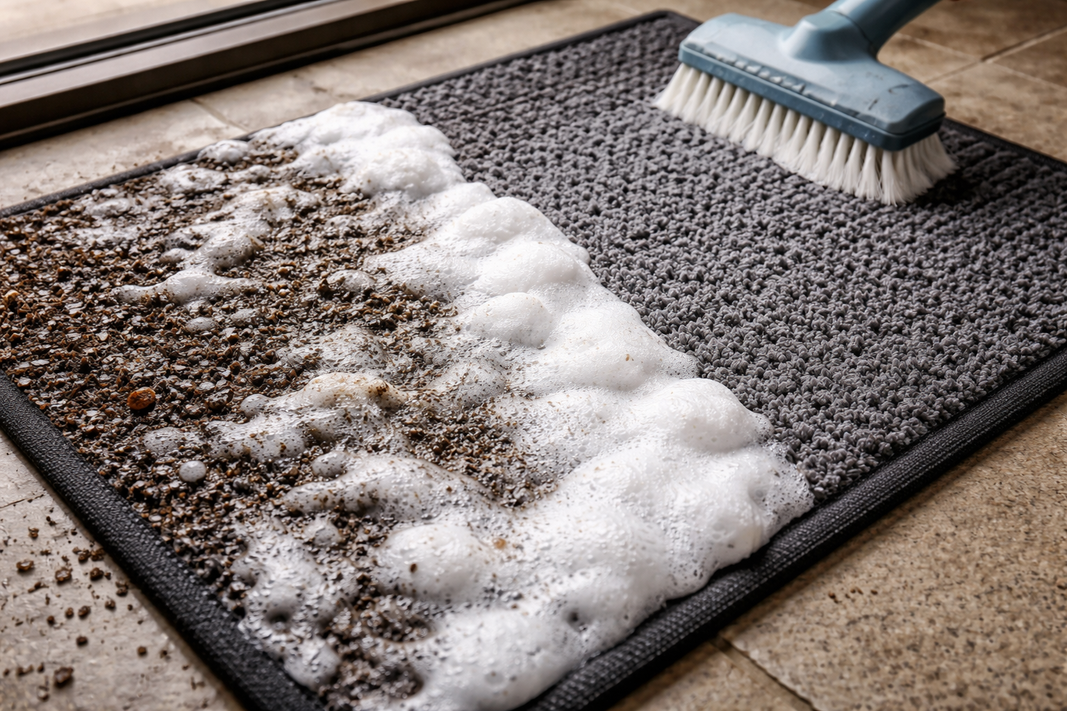 Galvenais noslēpums ir nevis kārtīgi saslapināt paklāju, bet izmantot tikai biezas putas, kas smalki uzsūks visu ielas sāli un ielu dubļus.